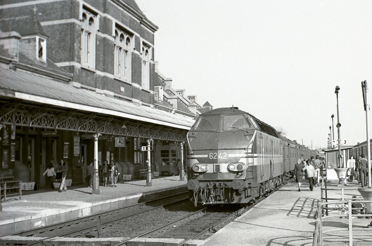 Deze locomotief behoort tot de reeks 62. Ze staat met enkele M 2-rijtuigen aan het perron. Links zien we het stationsgebouw met aangebouwde luifel. Op de perrons bevinden zich vele reizigers.