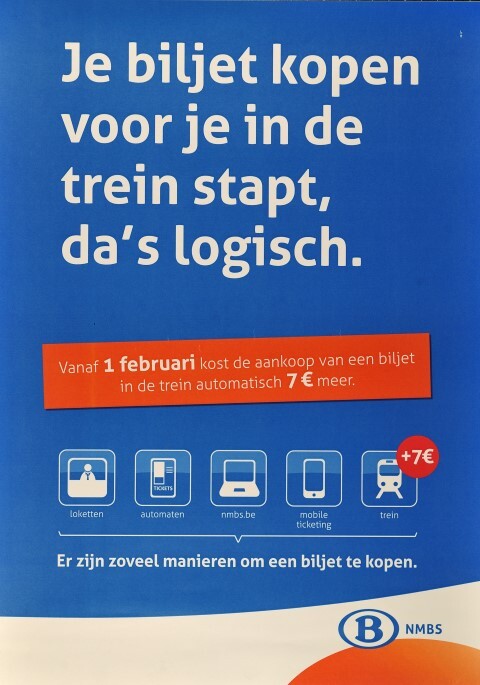 Deze blauwe affiche maakt deel uit van een sensibiliseringscampagne die reizigers wil aanmoedigen hun vervoersbewijzen te kopen vooraleer ze de trein opstappen. De affiche specifieert met behulp van pictogrammen welke verschillende kanalen er beschikbaar zijn om biljetten te kopen. Ze waarschuwt ook voor het supplement dat betaald moet worden wanneer men het biljet pas op de trein wil kopen: ‘Vanaf 1 februari kost de aankoop van een biljet in de trein automatisch 7 € meer. loketten automaten nmbs.be mobile ticketing trein Er zijn zoveel manieren om een biljet te kopen.’