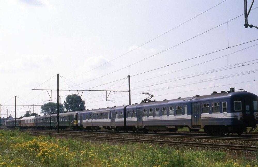 Deze fotogroep bevat twee dia's. Motorstel 600 (reeks 05, schijf 1970 'luchthaven') rijdt een testrit ter hoogte van Ezemaal, nabij Tienen. Dit stel is gekoppeld aan motorstel 158, dan volgt een meetrijtuig en motorstel 050. Schenking van Myriam Hendrickx.
