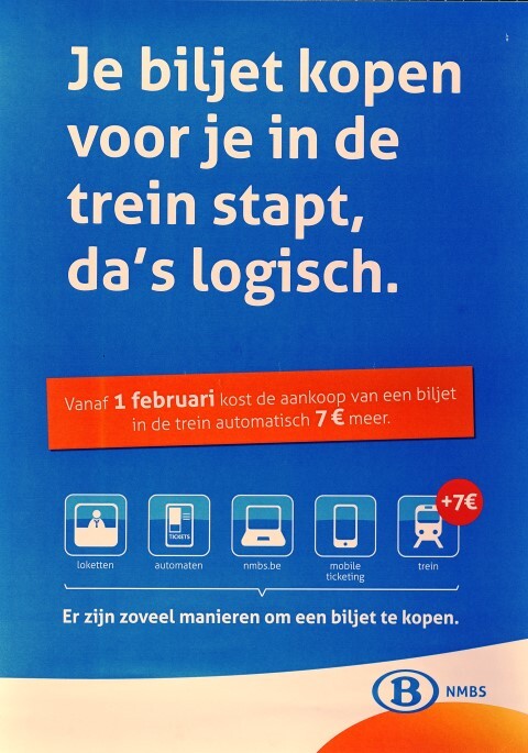 Deze blauwe affiche maakt deel uit van een sensibiliseringscampagne die reizigers wil aanmoedigen hun vervoersbewijzen te kopen vooraleer ze de trein opstappen. De affiche specifieert met behulp van pictogrammen welke verschillende kanalen er beschikbaar zijn om biljetten te kopen. Ze waarschuwt ook voor het supplement dat betaald moet worden wanneer men het biljet pas op de trein wil kopen: ‘Vanaf 1 februari kost de aankoop van een biljet in de trein automatisch 7 € meer. loketten automaten nmbs.be mobile ticketing trein Er zijn zoveel manieren om een biljet te kopen.’