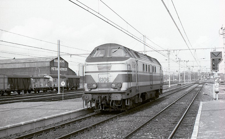 Deze locomotief behoort tot de reeks 61. Links zien we een aantal gesloten goederenwagens opgesteld in de bundel. Rechts zien we een stopsein type II. Dit sein is rechts van het spoor opgesteld, vandaar de ronde plaat met pijl erop. Deze pijl duidt aan dat dit sein het spoor links ervan bedient. Schenking van Myriam Hendrickx.