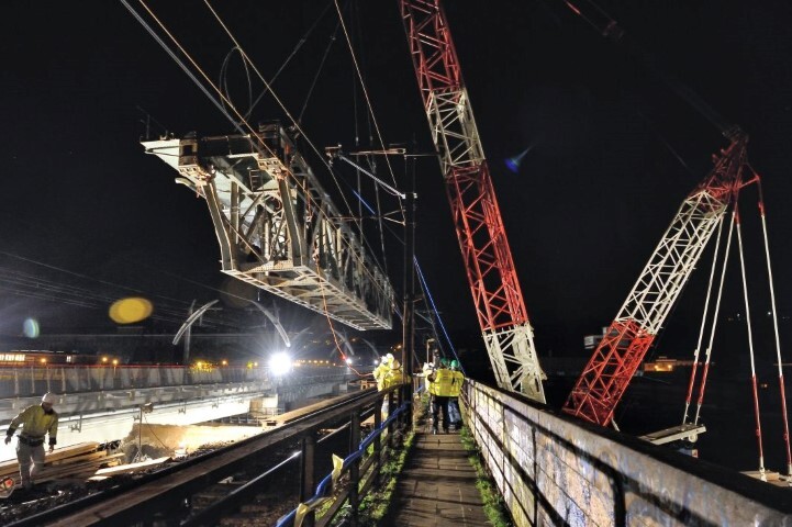 BeschrijvingDe groep bevat 30 digitale foto's. Eén van de drie overspanningen van de 'Pont du Luxembourg’, bestemd voor Train World, wordt 's nachts met behulp van een grote kraan gedemonteerd.