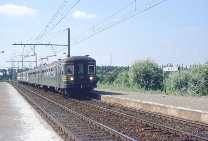 Deze fotogroep bevat twee dia's. Op beide foto's zien we tweeledig motorstel 183 (reeks 00, schijf 1962) dat samen met een motorstel een reizigerstrein vormt. Op de eerste foto rijdt motorstel 183 vooraan (te zien aan de gele koplampen). Op het perron zien we een stationsnaambord. Op de tweede foto vormt het stel 183 de achterkant van de trein (te zien aan de rode sluitlampen). Schenking van Myriam Hendrickx.