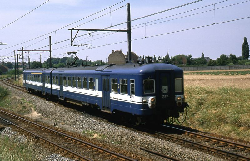 Deze fotogroep bevat vier dia's. We zien motorstellen 597 en 598 (reeks 05, schijf 1970 'luchthaven') op spoorlijn 36, aan de vertakking naar de luchthaven te Zaventem.