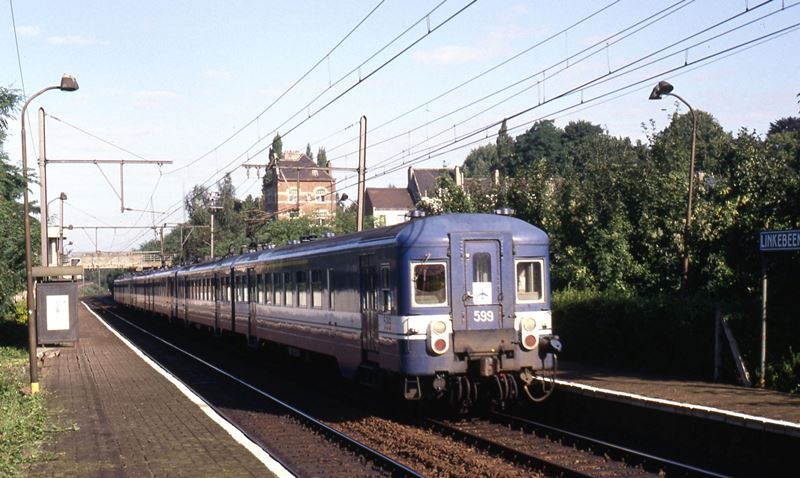 Een reizigerstrein met tweeledig motorstel 599 (reeks 05, schijf 1970 'luchthaven') staat aan het perron in station Linkebeek. Aan deze reizigerstrein zijn nog motorstellen 597 en 595 van hetzelfde type gekoppeld. Op het perron staan verlichting en een stationsnaambord. Station Linkebeek ligt langs lijn 124 (Brussel-Zuid - Charleroi-Zuid). Schenking van Myriam Hendrickx.