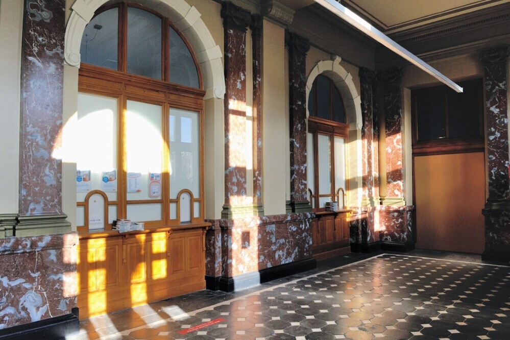 TitelGerestaureerde lokettenzaal van het station Schaarbeek (1887)
