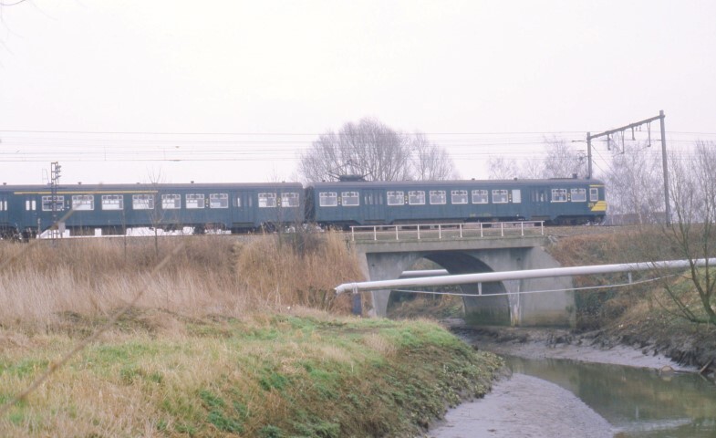 BeschrijvingTweeledig motorstel 213 rijdt op een verhoogde berm en passeert een brug over een waterloop. Het motorstel behoort tot reeks 00, schijf 1963.