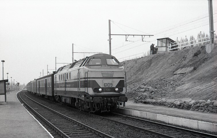 Deze locomotief behoort tot de reeks 61. Ze heeft M 2-rijtuigen aan de haak. De locomotief is geel geschilderd met brede groene banden. Het perron is met een schuilhuisje, elektrische verlichtingspalen en een lichtsein uitgerust. Rechts zien we het talud van de opgehoogde lijn 75. Enkele arbeiders plaatsen een schuilhuisje op het nieuw aangelegde perron. Schenking van Myriam Hendrickx.