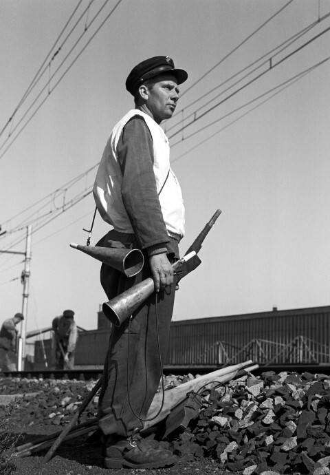 De foto toont de schildwacht van een spoorleggersploeg. Zijn taak is om de omgeving in het oog te houden en om de spoorwerkers bij eventueel gevaar (met een hand- of geluidssein) te waarschuwen. Hij beschikt over twee hoorns en een groene, gele en rode seinvlag. In de achtergrond zien we enkele spoorleggers aan het werk.
