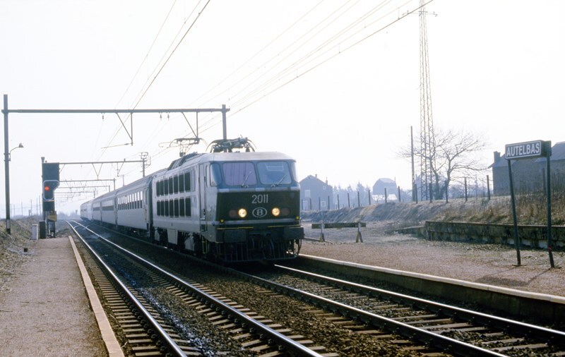 Elektrische locomotief 2011 rijdt voorbij station Autelbas met een internationale trein. Op de perrons staan een stationsnaambord en een lichtsein. Dit station ligt langs lijn 162 (Namen - Luxemburgse grens).