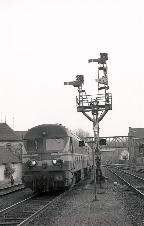 Deze locomotief behoort tot de reeks 59 en heeft een zusterlocomotief aan de haak. Rechts van de locomotief zien we een mechanisch sein (kandelaarsein) van het driestanden stelsel. De bovenste twee rode stopseinarmen geven seinen voor het gewone treinverkeer. De kleinere paarse seinarm daaronder geeft seinen voor rangeringen (kleine bewegingen). Schenking van Myriam Hendrickx.