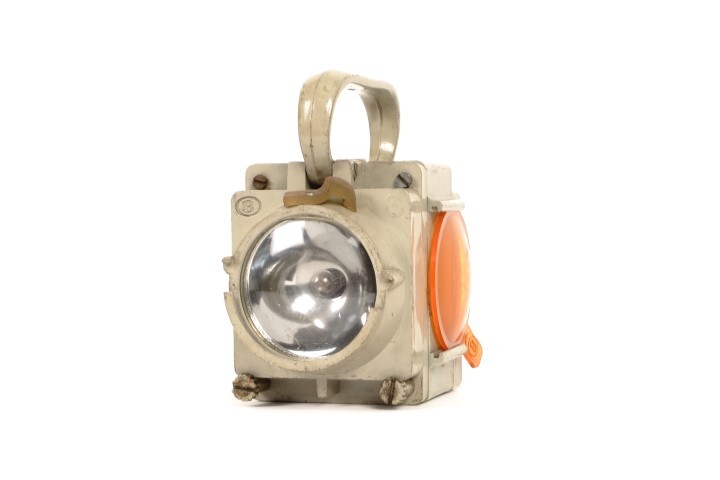 Deze noodlamp voor treinen werkt op batterijen en heeft twee knopjes om de lamp aan te schakelen. Het handvat bevindt zich bovenaan en achteraan is er een klep waardoor de lantaarn vastgezet kon worden. Vooraan zien we een doorzichtig glas, waarover een rood of oranje lens kan geschoven worden. Deze lenzen bevinden zich aan de zijkanten van de lamp.Het logo van de NMBS staat vooraan, bovenaan en op de lenzen.