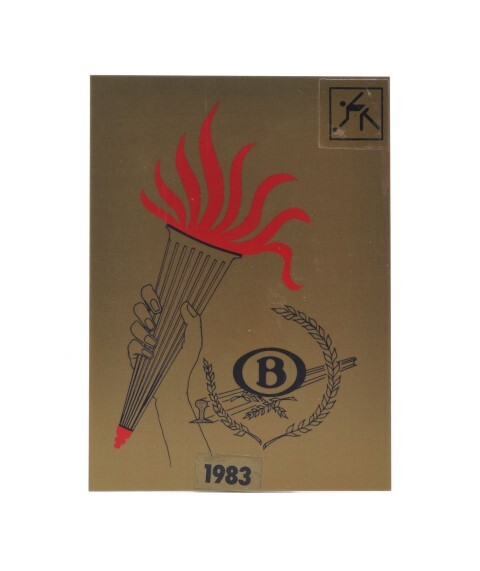 Op het metalen plaatje staat een hand die een brandende toorts vasthoudt. Daarnaast is het NMBS-logo afgebeeld boven een spoorstaaf en binnen een laurierkrans. Bovenaan rechts hangt een sticker met een icoon dat waarschijnlijk duidt op handbal. Onderaan hangt een sticker met de datum 1983.