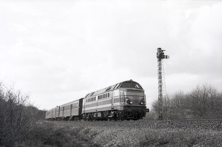 BeschrijvingDeze locomotief behoort tot de reeks 51 en heeft M 2-rijtuigen aan de haak. Rechts naast de locomotief zien we een mechanisch waarschuwingssein.