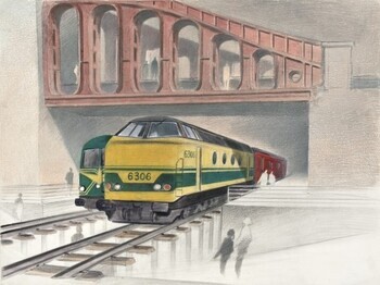 BeschrijvingDeze ontwerptekening werd gemaakt tijdens de conceptfase van het spoorwegmuseum Train World. Op de tekening zien we hoe een echte spoorwegbrug zal geïntegreerd worden in het museum. Onder de brug staan twee diesellocomotieven.