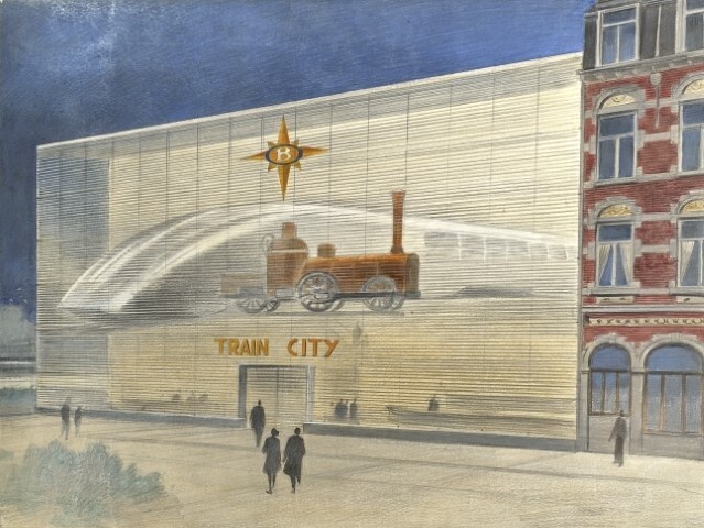 Deze ontwerptekening werd gemaakt tijdens de conceptfase van het spoorwegmuseum Train World. Op de tekening zien we de glazen voorgevel met opschrift 'TRAIN CITY'. Binnenin zien we 'Le Belge', een hogesnelheidstrein en de 'Etoile du Nord'.