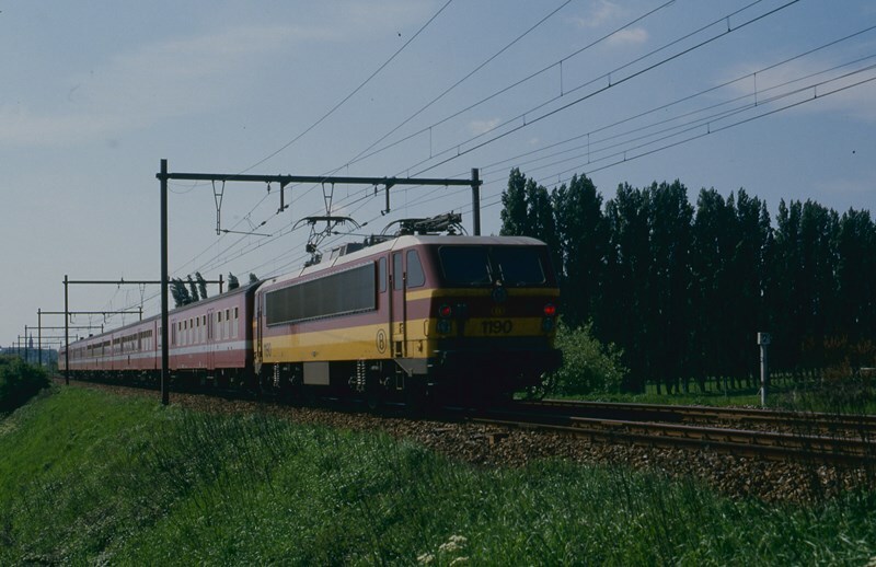 Deze fotogroep bevat twee dia's. We zien de voor-en achterkant van een reizigerstrein die wordt geduwd door elektrische locomotief 1190 en bestuurd vanuit een rijtuig met stuurpost. De sleep bestaat uit bordeaux M 4-rijtuigen. Schenking van Myriam Hendrickx.