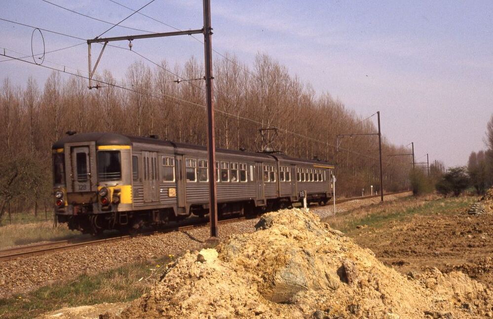 BeschrijvingTweeledig motorstel 129 (reeks 00, schijf 1956 'Budd') rijdt op een enkelsporige lijn in een landelijke omgeving.