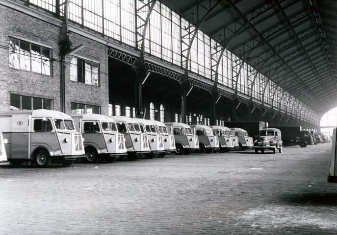 De dia is een reproductie van een fotoafdruk. Hij toont bestelwagens van het merk Citroën in een van de hallen uit glas en metaal. Ze stonden in voor het natransport van colli's die in de aansluitende hal per trein werden aangevoerd.