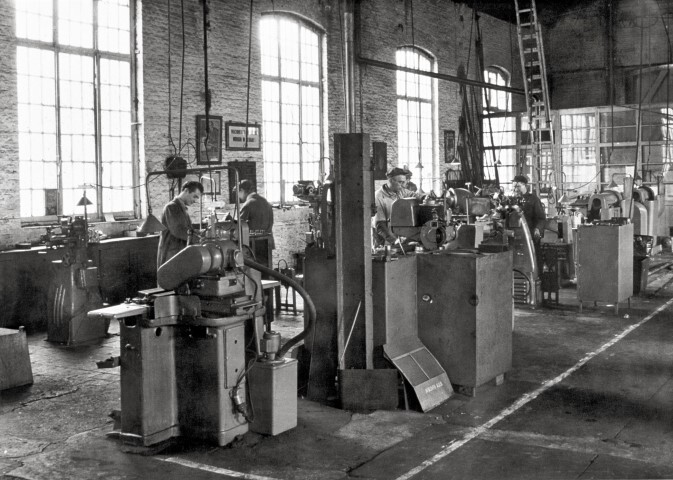 BeschrijvingDeze fotogroep betstaat uit twee dia's. Het zijn reproducties van fotoafdrukken. De dia's tonen het interieur van een werkplaats waar herstellingen worden uitgevoerd.