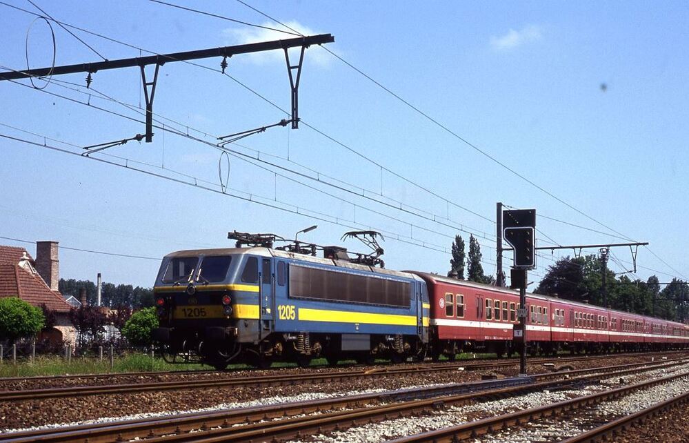 Deze fotogroep bevat twee dia's. We zien de voor- en achterkant van een reizigerstrein. De sleep M 4-rijtuigen wordt bestuurd vanuit een rijtuig met stuurpost en geduwd door elektrische locomotief 1205. We zien eveneens een bord dat het lijnnummer aangeeft en een lichtsein. Schenking van Myriam Hendrickx.