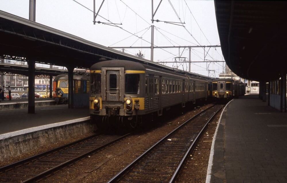Deze fotogroep bevat twee dia's. Er staan verschillende motorstellen in het station: we zien motorstel 139 met daarachter motorstel 531. Op het naastliggende spoor is motorstel 148 te zien en verder staat links ook nog een elektrische locomotief reeks 22. We zien de perrons en de overkapping. Motorstellen 139 en 148 behoren tot reeks 00, schijf 1956 'Budd'. Schenking van Myriam Hendrickx.