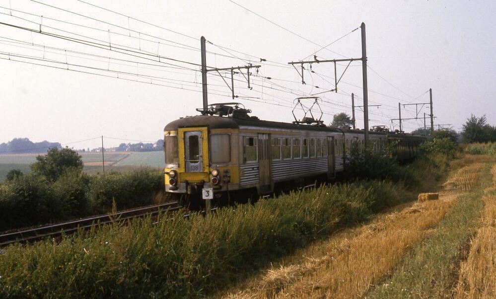 BeschrijvingDrie gekoppelde motorstellen met vooraan stel 138 rijden op volle baan in een landelijke omgeving. Motorstel 138 behoort tot reeks 00, schijf 1956 'Budd'.
