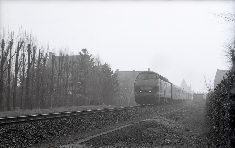 BeschrijvingDeze locomotief behoort tot de reeks 63. Ze heeft M 2-rijtuigen aan de haak. In de achtergrond zien we vaag het dak van het stationsgebouw.
