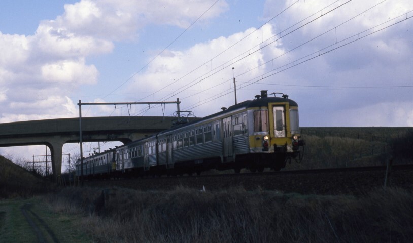 BeschrijvingMotorstel 135 (reeks 00, schijf 1956 'Budd') vormt samen met een ander tweeledig motorstel een reizigerstrein.