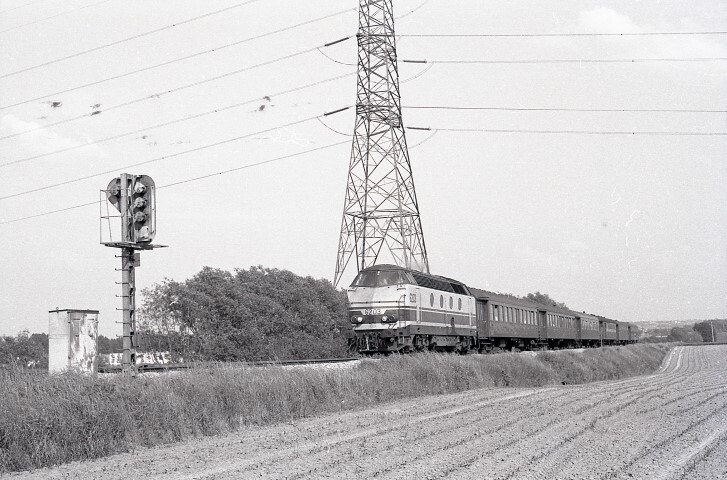 Diesellocomotief 6203 behoort tot het type 62 en sleept enkele K 2-rijtuigen. Links zien we de achterzijde van een permissief sein type II en bijhorende seinkast. In deze kast bevindt zich de apparatuur om het sein aan te sturen. Schenking van Myriam Hendrickx.