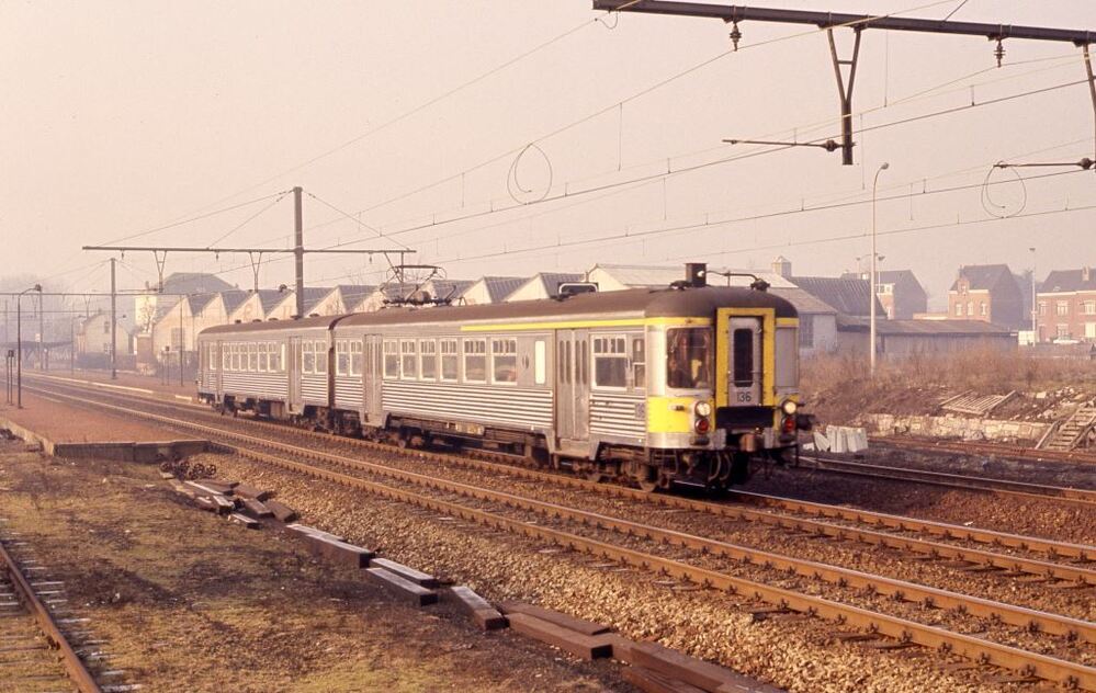 BeschrijvingDeze fotogroep bevat twee dia's. Motorstel 136 (reeks 00, schijf 1956 (Budd') heeft net het station verlaten. In de achtergrond zien we nog net de perrons.