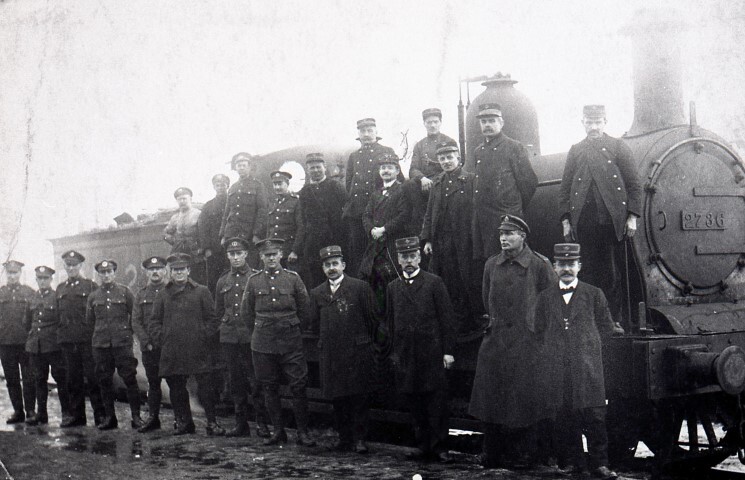 Reproductie van een postkaart. We zien stationspersoneel en vermoedelijk Britse militairen die voor stoomlocomotief 2736 van de Railway Operating Division (ROD) poseren. Dit was de eerste Britse locomotief die na de Eerste Wereldoorlog tot in station Moeskroen kon rijden.
