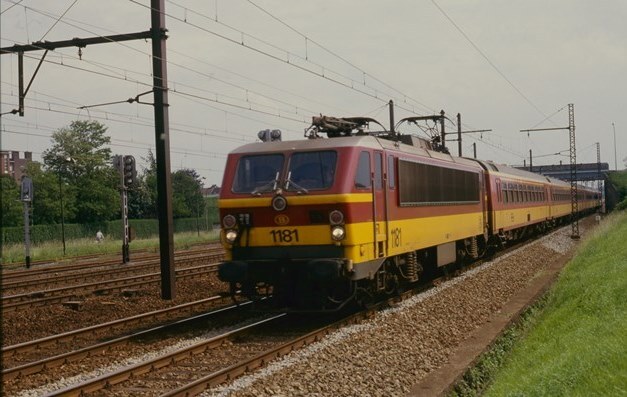 BeschrijvingElektrische locomotief 1181 rijdt met een Beneluxtrein voorbij Duffel. Tussen de sporen zien we lichtseinen.