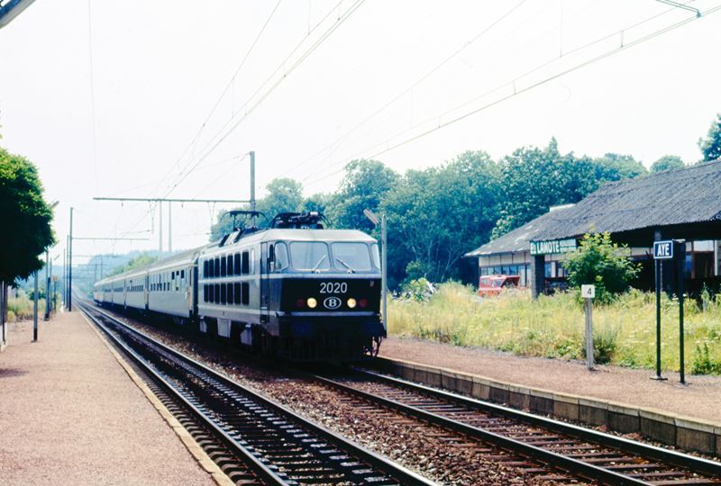 Elektrische locomotief 2020 sleept een internationale trein voorbij station Aye. Op de perrons zien we een hectometerpaal met de vermelding '4' en een stationsnaambord. Aye ligt langs lijn 162 (Namen - Luxemburgs grens). Schenking van Myriam Hendrickx.
