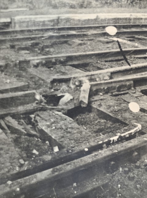 BeschrijvingOp de foto zien we sporen die door het verzet vernield zijn. Op deze manier probeerden zij de mobiliteit van de bezetter te blokkeren.