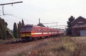 BeschrijvingEen vierledig elektrisch motorstel (reeks 08, schijf 1975) passeert voorbij het oude stationsgebouw.