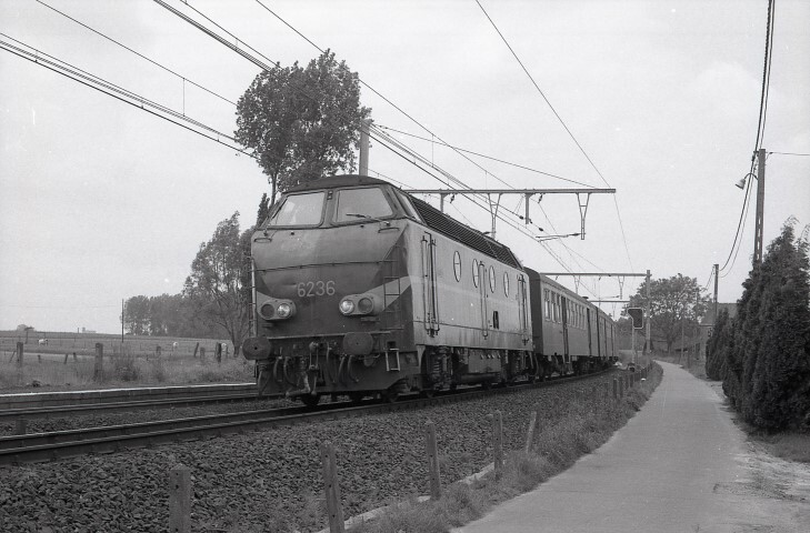 Deze locomotief behoort tot de reeks 62. Ze heeft een reizigerstrein bestaande uit M 2-rijtuigen aan de haak. Rechts aan het einde van de trein zien we een permissief tegenspoorsein. Het normale treinverkeer rijdt links, maar soms is het nodig (bv. tijdens werken aan de sporen) om de treinen rechts te laten rijden. In dat geval regelen de tegenspoorseinen het treinverkeer. Schenking van Myriam Hendrickx.