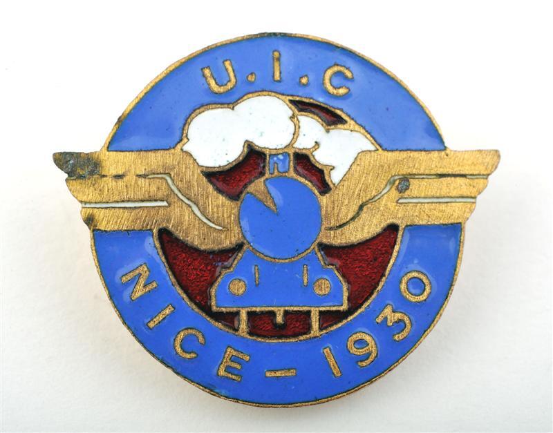 Gekleurde ronde knoop met in het veld een gevleugelde stoomlocomotief tegen een rode achtergrond. De vleugels zijn verguld. De omtrek is blauw en bevat als inscriptie 'U.I.C. Nice -1930'.