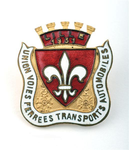 Gekleurde knoop met in het veld een rode driehoek met een witte fleur-de-lys. Links en rechts de afbeelding van twee medailles. Bovenaan een kroon met daarin 'Lille 1931'. De omtrek is wit en bevat als inscriptie 'Union Voies Ferrees Transports Automobiles'. Schenking van dhr. Ghilain.