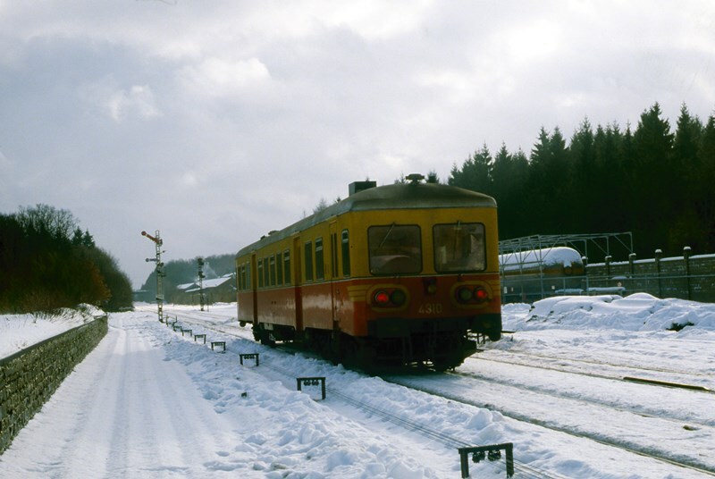 BeschrijvingMotorwagen 4310 rijdt door een besneeuwd landschap. Naast de spoorlijn zien we trekdraden voor het mechanisch sein dat we verderop kunnen zien.