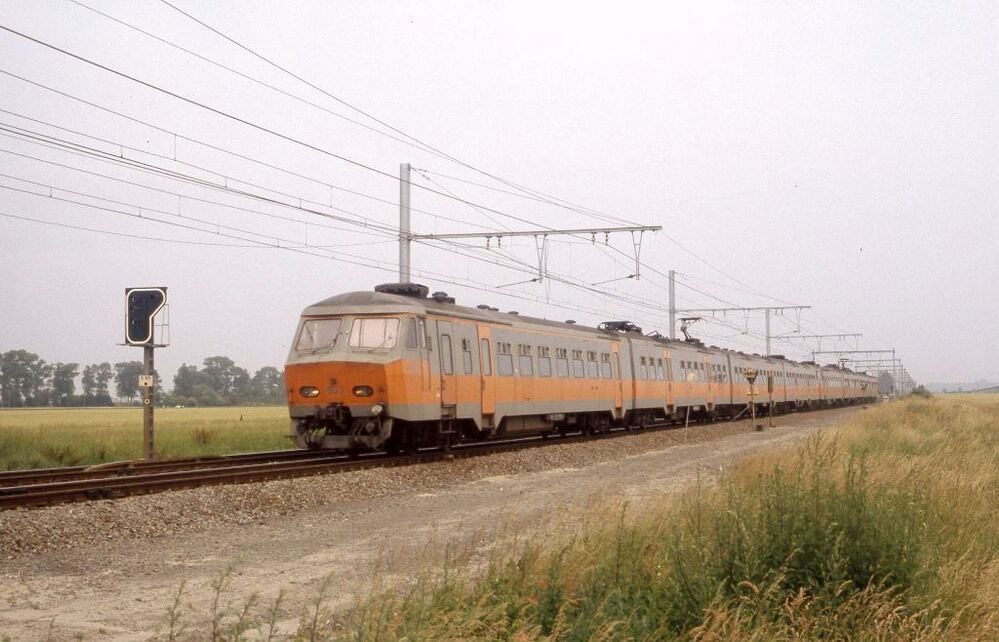 Vierledig elektrisch motorstel 812 (reeks 08, schijf 1975) rijdt op volle baan. Langs de spoorlijn staat een lichtsein en tussen de sporen zien we een krokodil ter hoogte van het sein.