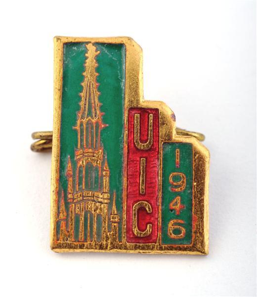Gekleurde pin met drie vertikale velden van ongelijke hoogte. Links de toren van het stadhuis van Brussel tegen een groene achtergrond. In het midden 'UIC' tegen een rode achtergrond. Rechts de datum 1946 tegen een groene achtergrond.
