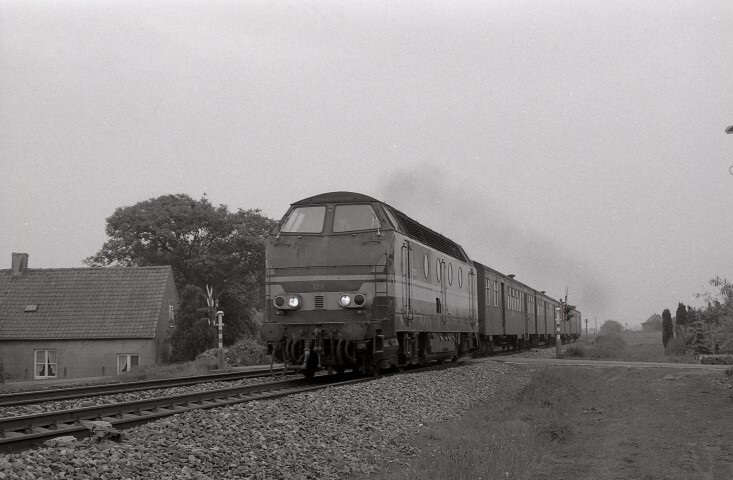 Deze locomotief behoort tot de reeks 62 en heeft M 2-rijtuigen aan de haak. De trein bevindt zich aan een overweg. Aan beide zijden van de trein zien we een andreaskruis voorzien van lichten.