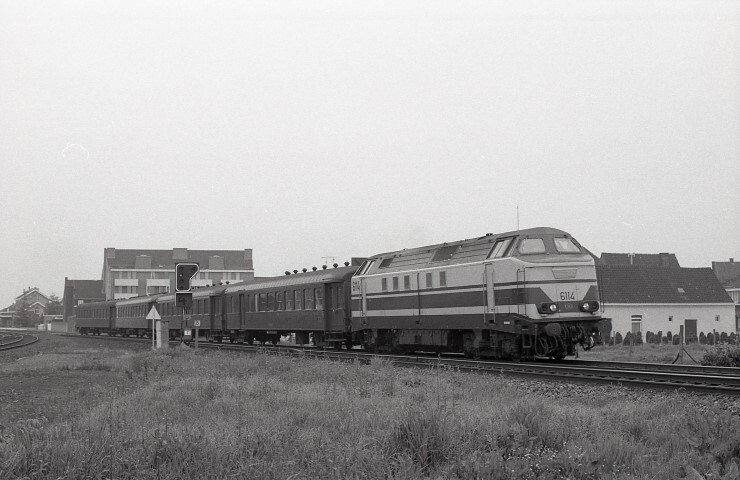 Deze locomotief behoort tot de reeks 61. Ze heeft K 1-rijtuigen aan de haak. De trein rijdt het station Lichtervelde uit naar Deinze via spoorlijn 73. Links van het spoor zien we een van de inritseinen van het station. Het is een stopsein van het type III. Uiterst links zien we nog net de sporen van spoorlijn 66 (Brugge - Kortrijk). Schenking van Myriam Hendrickx.