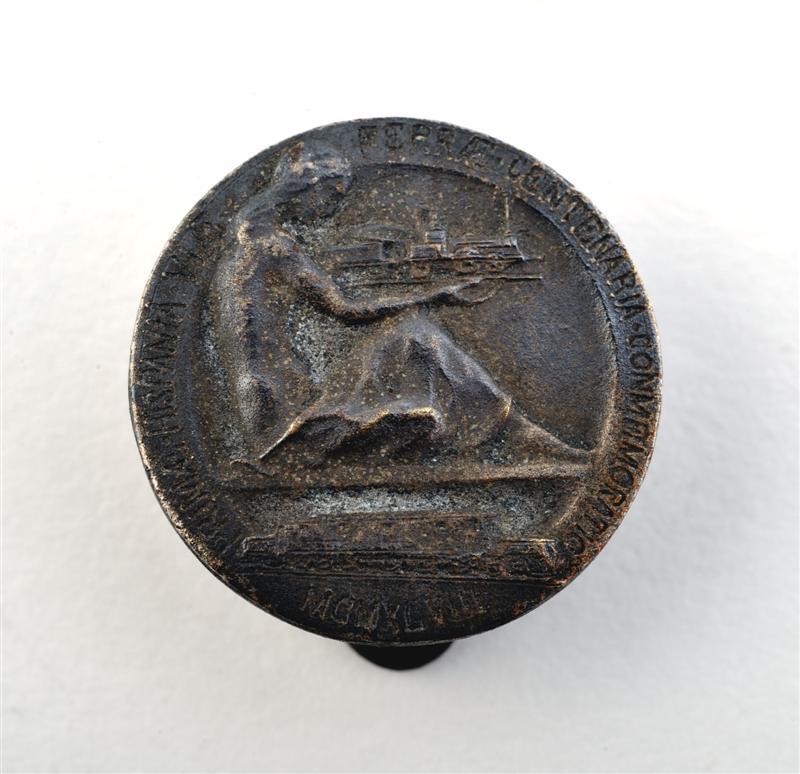 Rond aandenken met achteraan een knoop. In het veld een zittende vrouw die Spanje verbeeldt. Zij houdt in haar armen een elektrische locomotief. Daaronder een zijaanzicht van een elektrische locomotief. Over de omtrek 'Primae . Hispania . viae ferrae . centenaria . commemoratio ; MCMXLVIII'. Schenking van dhr. Ghilain.