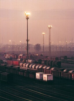 BeschrijvingDe foto toont een sporenbundel waar goederentreinen worden gevormd. De foto werd vermoedelijk gemaakt bij valavond in Antwerpen-Noord.