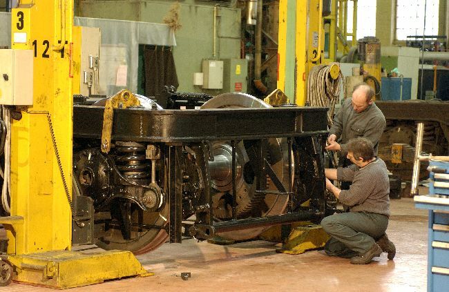 BeschrijvingDe groep bevat zes digitale foto's. Techniekers in de centrale werkplaats Salzinnes zijn aan het werk aan een draaistel van een locomotief.