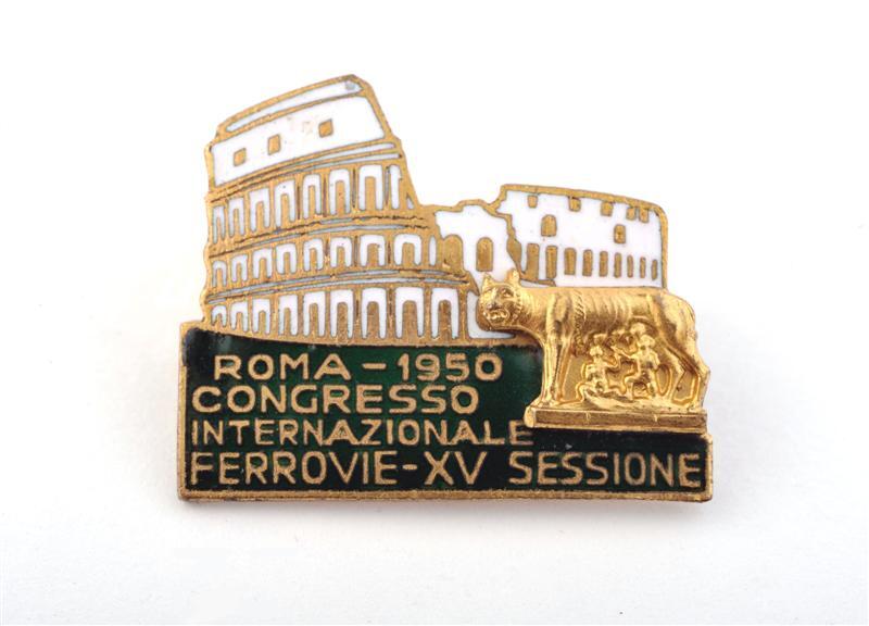 BeschrijvingGekleurde pin met het Colloseum in witte email en rechts de Romeinse wolvin. De afsnede is groen en bevat het opschrift 'Roma - 1950 Congresso Internazionale ferrovie-XV Sessione'.