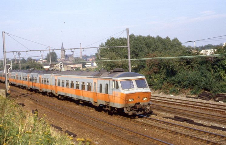 BeschrijvingDrie gekoppelde vierledige elektrische motorstellen van de reeks 08 vormen samen een reizigerstrein. De trein rijdt op een viersporig traject. Het eerste stel is het nummer 815, dat behoort tot de schijf 1975.