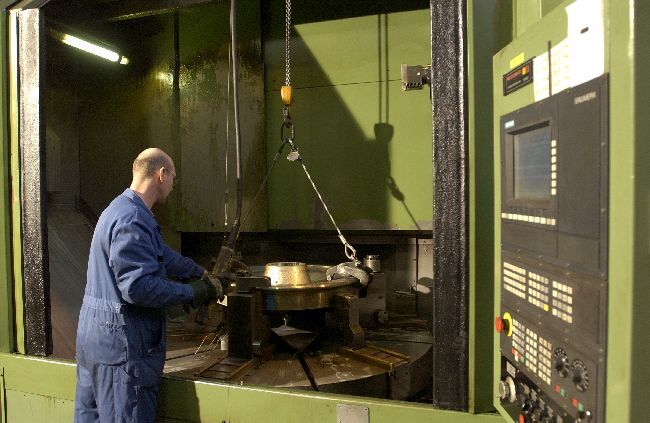 BeschrijvingDe groep bevat acht digitale foto's. In de centrale werkplaats Salzinnes is een technieker aan het werk aan de verticale draaibank 'Didesheim'. Vermoedelijk is hij een wielband aan het frezen.